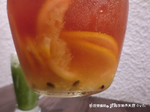 底層還沉著百香果果粒和柳橙薄片,色彩很鮮豔!