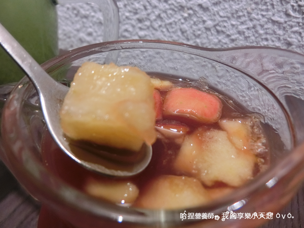料很多的水果茶,喝起來柑橘類水果的味道較重,亦有百香果的香味,甜度適中蠻好喝的