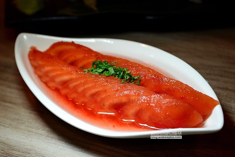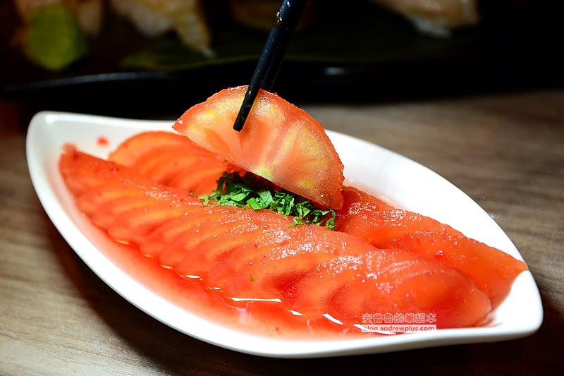 番茄切成薄片,加上清爽微甜的冰梅紫蘇醬汁,吃完口齒留香無負擔