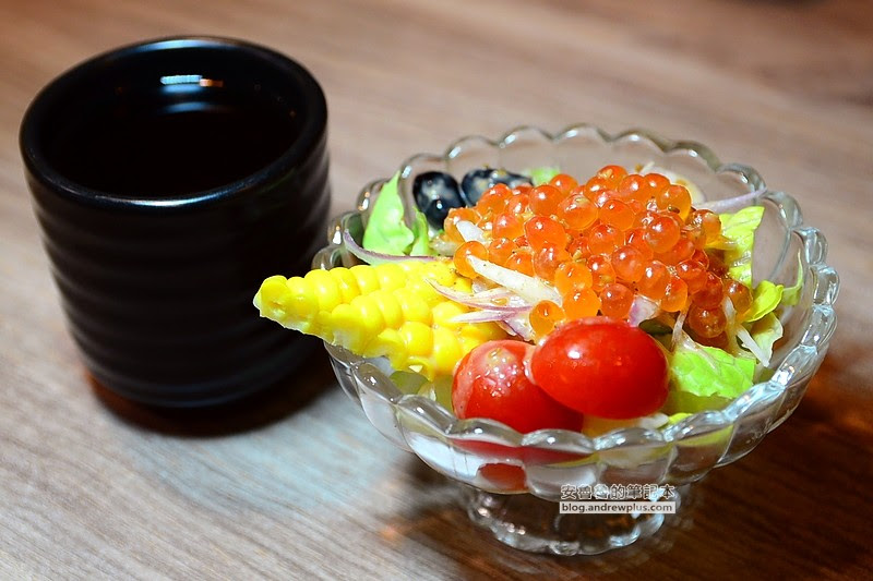 ▼胡麻鮭魚卵沙拉(740元套餐附的)740元套餐的沙拉是以和風沙拉食材為基底,再加上鮭魚卵,醬料則改成了帶有濃郁香氣胡麻醬,鮭魚卵吃起來波滋波滋順口無腥味,而這道沙拉主要的鹹味也是來自於鮭魚卵,店家還有奉上熱麥茶!
