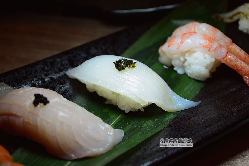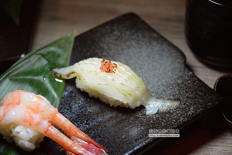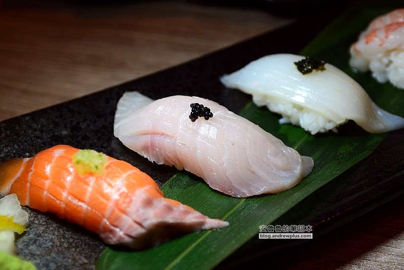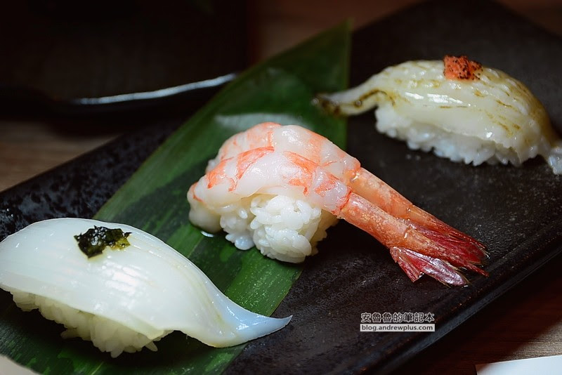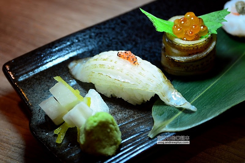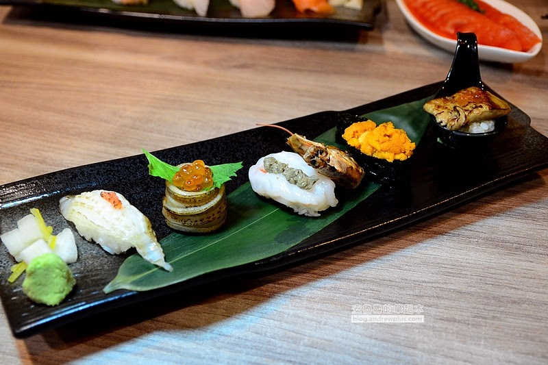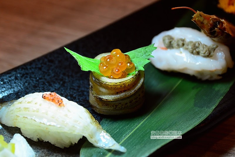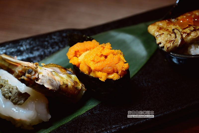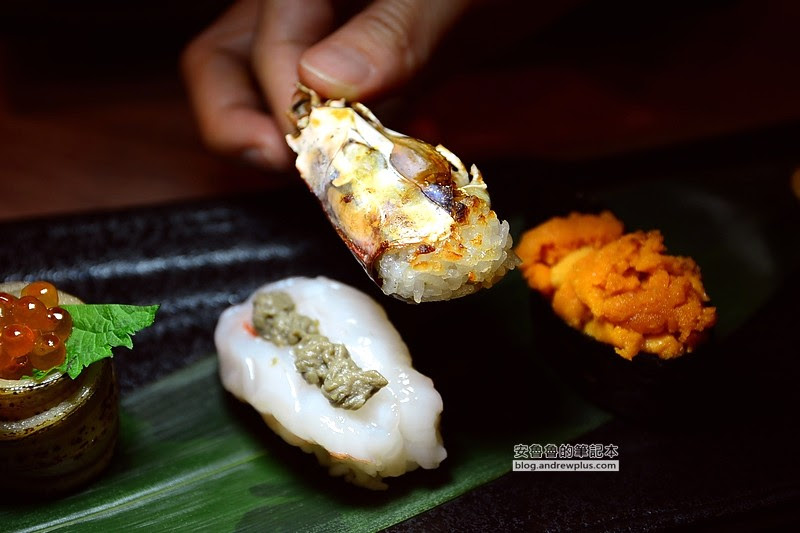 由左而右分別是:入口即化的比目魚、星鰻包裹著米飯紫蘇葉和鮭魚卵點綴、天使紅蝦除了蝦身上頭加入蟹膏外,還將烤蝦頭一併附上、海膽軍艦捲、鵝肝握壽司