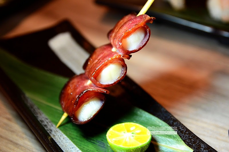 選出油脂分布比例較少帶點厚度的培根,裡頭放入整顆干貝,一口咬下外脆內軟帶有干貝獨特氣味。