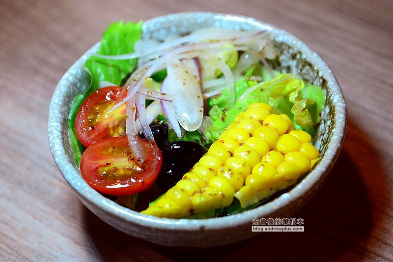 適當大小好入口的清脆生菜、搭配鮮甜的小番茄和玉米、微嗆辣的紫洋蔥以及鮮少在沙拉出現的黑豆。和風醬汁鹹甜比例剛好,單吃醬汁會偏鹹了些,這讓沙拉整體吃起來不會太清淡,很容易就一口一口吃光光