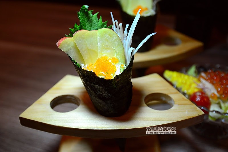 第一次吃到由蘋果、蝦卵、紫蘇、牛蒡、高麗菜絲組合而成的手捲,一入口是蘋果的脆、酸甜和紫蘇的迷人香氣,牛蒡、高麗菜絲增加了口感,還有適量的美乃滋畫龍點睛