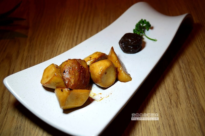 淡淡的醬燒香,上頭撒上香料,讓不討喜的菇菇味消失,只剩下Q彈脆口。餐點還貼心的附上軟Q的茶梅,可以轉換口腔裡的氣味。