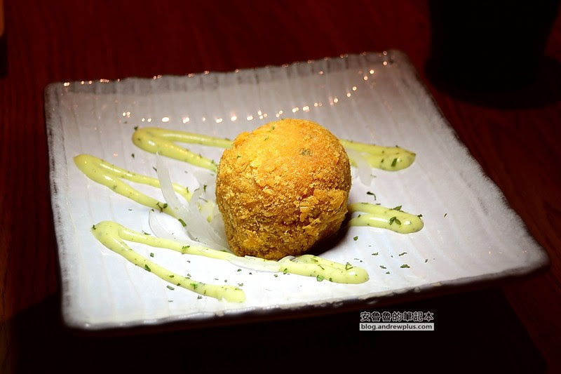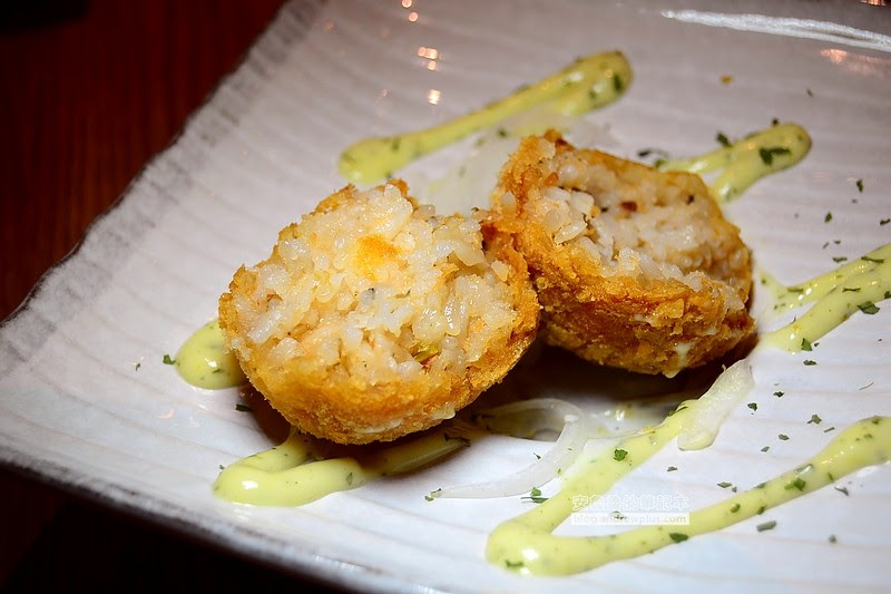 ▼這道菜上桌的時候,其實光看外觀還沒意會到這是顆飯糰,一直到咬開了之後,裡面粒粒分明、看起來油亮的飯粒露了出來,再加上散發出來的鮭魚香,令人食指大動