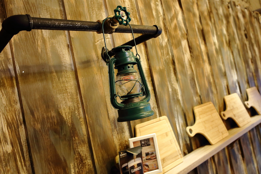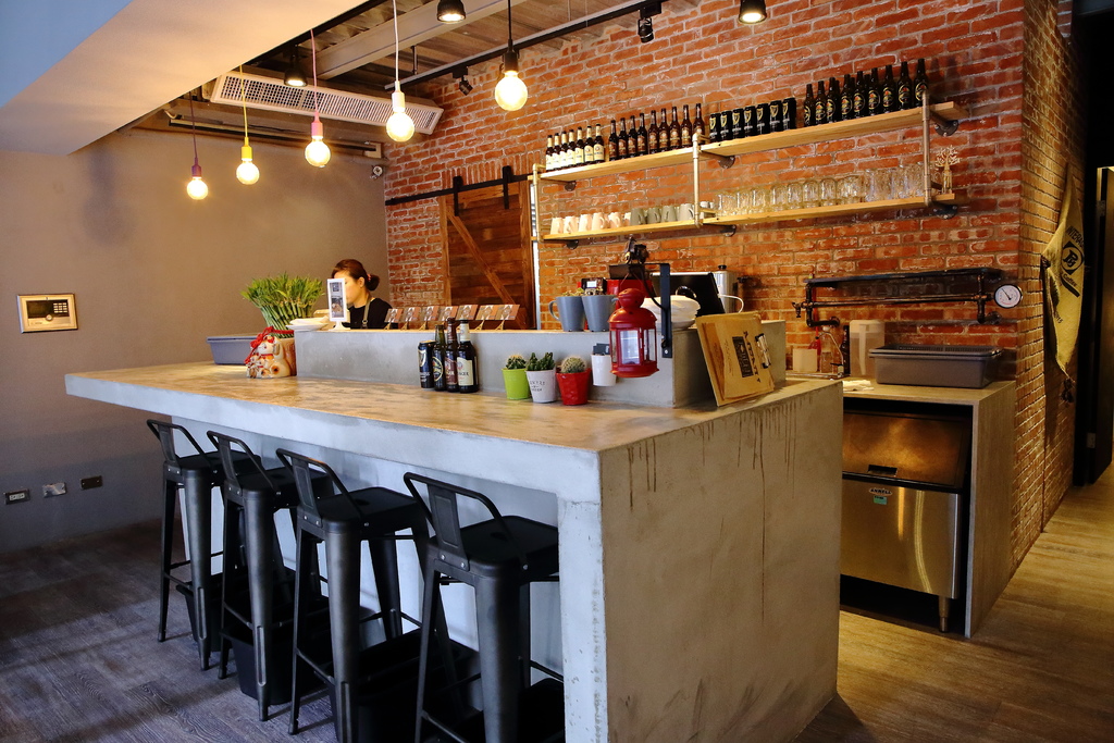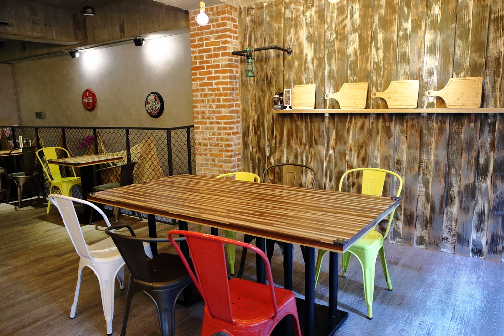 沿著樓梯上來二樓,裝潢走工業風,金屬感座椅與古早味金屬燈泡吊燈