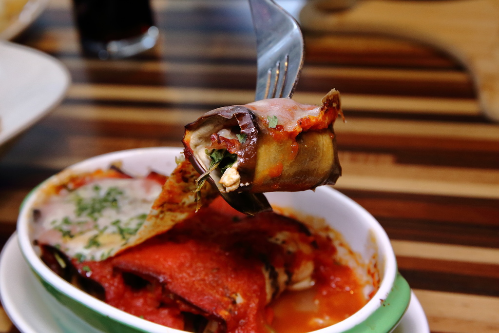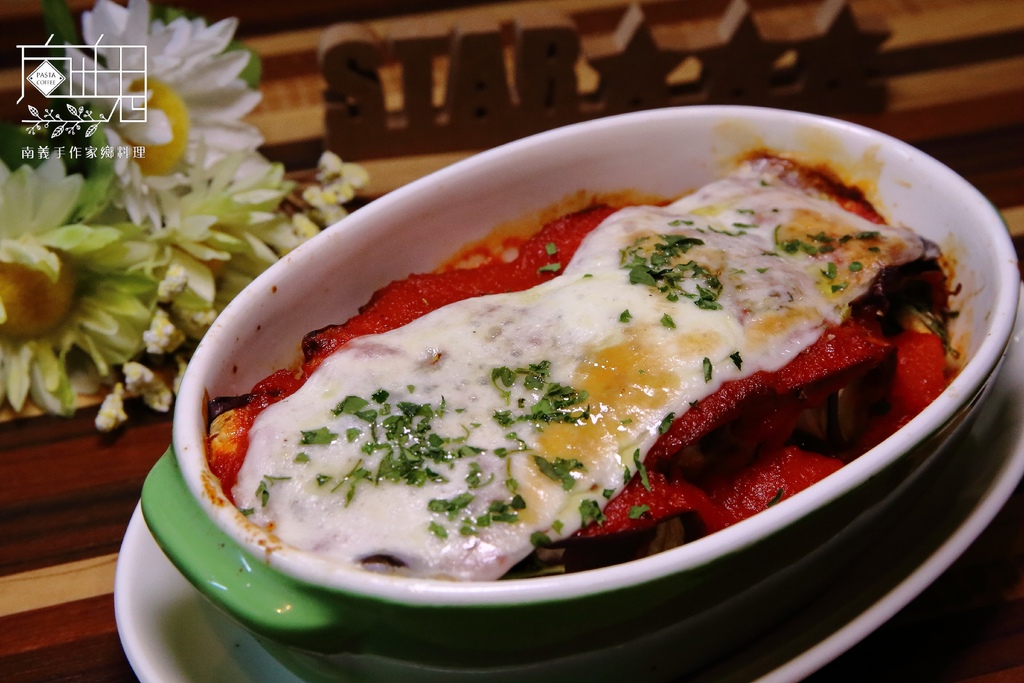 烤茄子上頭也有鋪滿了起司,裡面還有加入一些番茄紅醬,所以吃起來比較沒那麼膩
