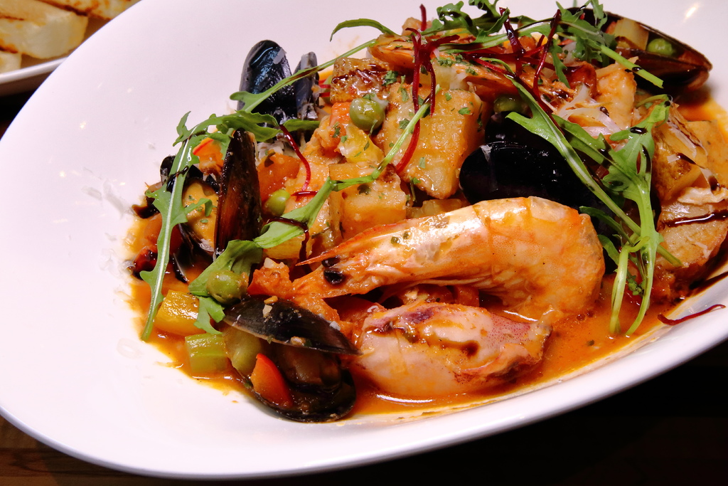 由白蝦、淡菜、小管等等豐富多樣的海鮮組成,透過傳統義式燉飯作法呈現,滿滿濃郁的海鮮湯汁,鹹香