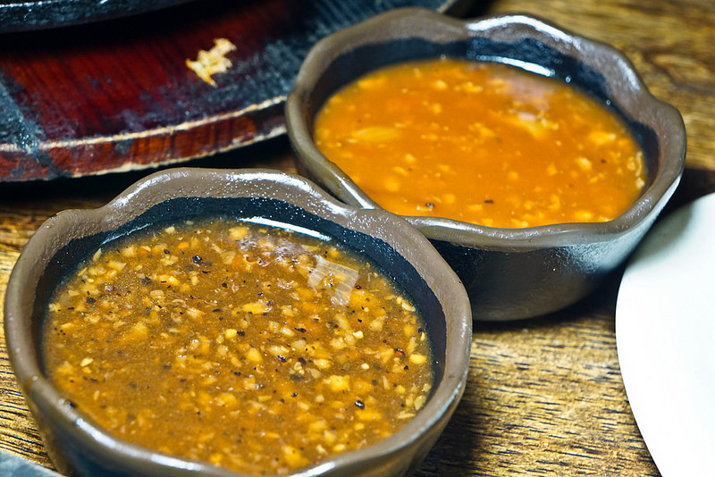 如前所述, 醬汁分開擺, 直接用沾的可以避免醬汁在牛排鐵板正熱時亂噴, 也蠻不錯