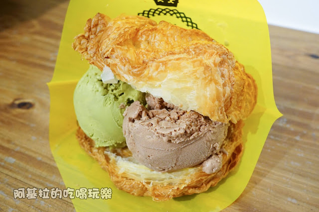 將泡芙切成橫兩半,裡面放兩球冰淇淋,拿在手上的感覺很大一個,沒辦法張開嘴巴當漢堡咬,還好店家有附一隻小湯匙讓顧客食用。