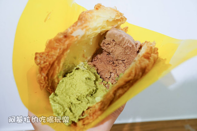 ▲冰淇淋是採用北海道十勝四葉牛乳製作,挖了一小匙放入嘴裡之後,先是感覺到冰涼綿密的口感,然後化成香甜的糖水,巧克力和抹茶的味道相當濃郁,其中帶有一點奶香,而且兩球的份量吃起來讓人很滿足,冰淇淋吃剩一點的時候,就可以連同外層的泡芙一起吃,味道會更有層次!