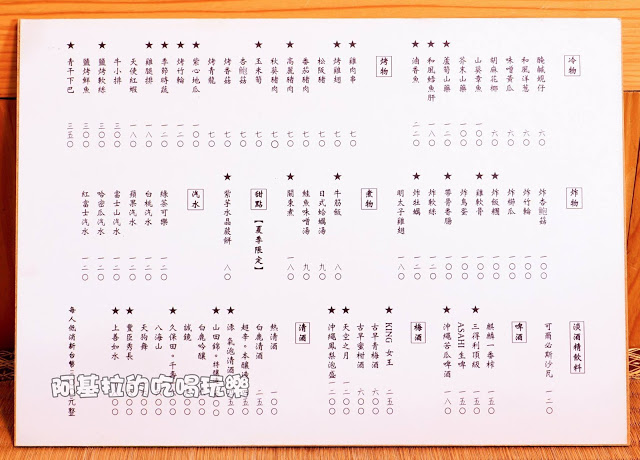 料理有分「冷物、烤物、炸物、煮物」,口味多達40種,絕對可以滿足饕客的味蕾!飲料的部份有「汽水、淡酒精飲料、啤酒、梅酒、清酒」,選擇性也相當多,不論會不會喝酒,來到這裡一樣可以暢飲一番。