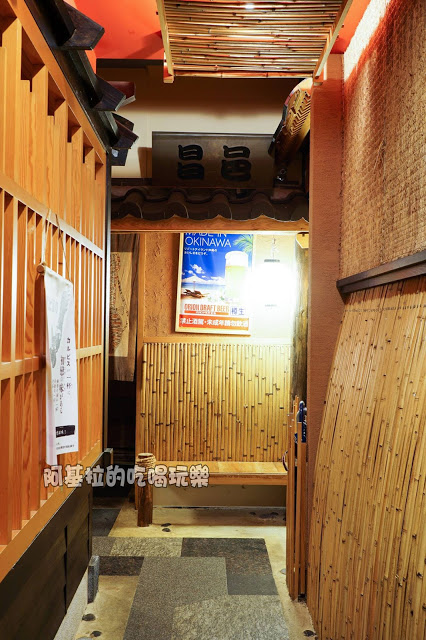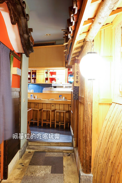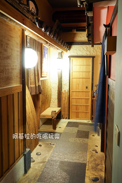 進門之後,我沒看到座位或是服務人員,而是一條小小又暗暗的走道,這張圖片是轉角的造景,從這裡開始就有濃濃的日本建築設計風格,感覺像是進入任意門一樣,瞬間來到了日本,不禁讓人期待接下來的情景。
