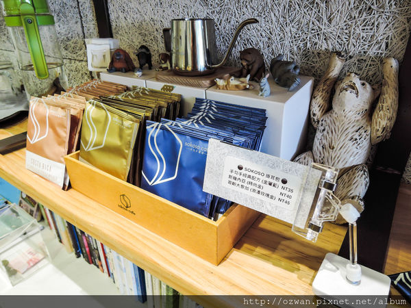 架子上擺放許多自家產品咖啡包,還有茶包。