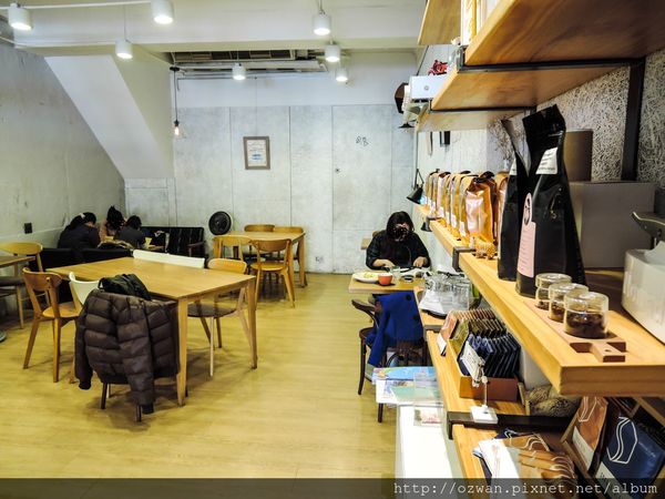 以木頭色系打造的精巧室內空間,6張桌子,約可接待20位客人,
