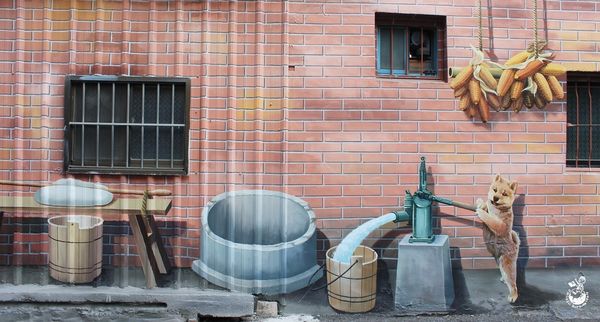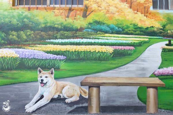▲個人最喜歡這面帶有古早味的彩繪牆,柴犬在打水的模樣相當討喜
