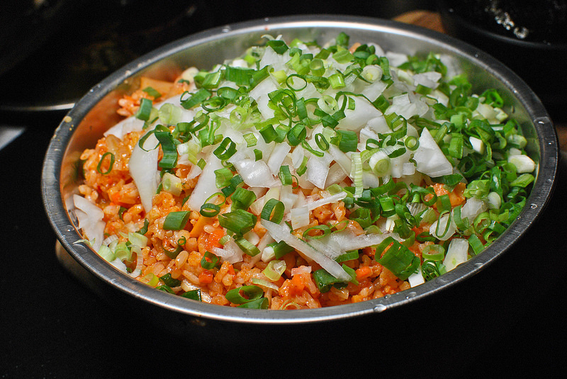 飯上來之前已經是熟的, 先下鍋炒, 稍後灑上海苔吃