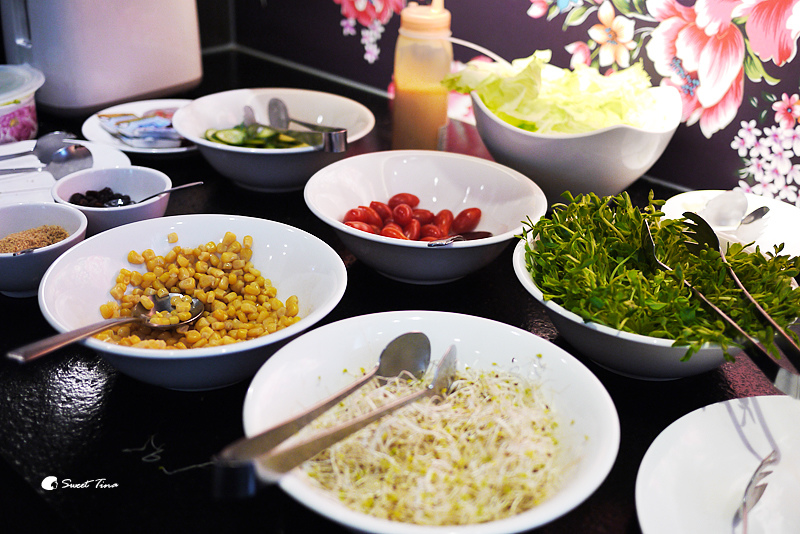 一旁還有沙拉,也提供了白飯和地瓜粥及配料,一樣都有多樣化的麵包及水果呢!