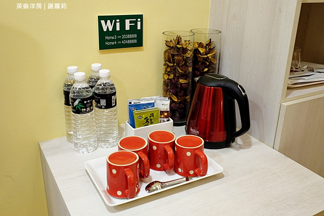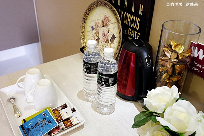 提供礦泉水、茶包、咖啡,硬體方面像是熱水壺、吹風機,當然有拋棄式的牙刷、牙膏、梳子及脫鞋也是少不了的囉!