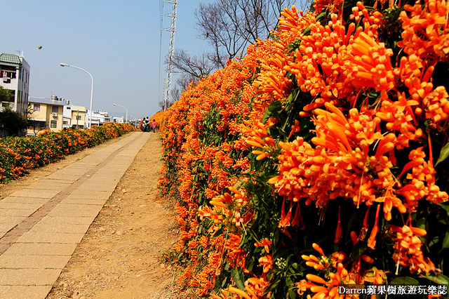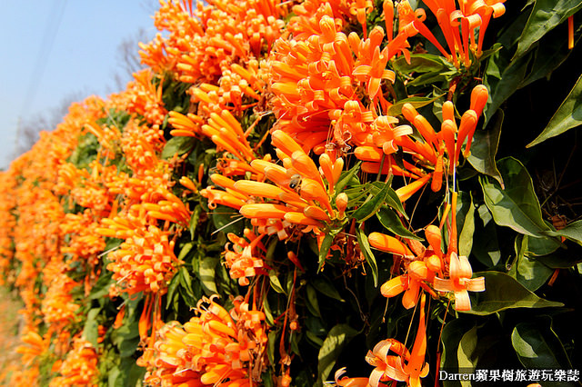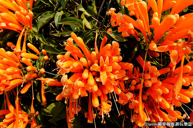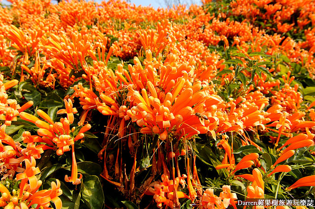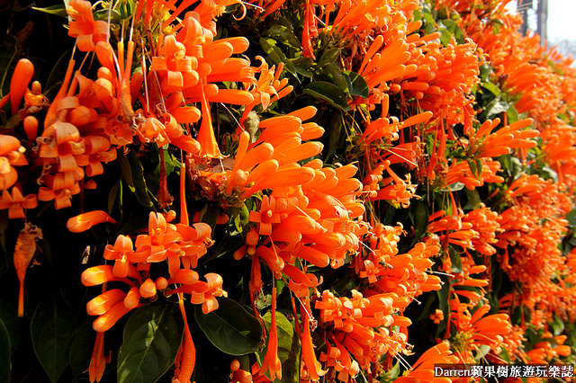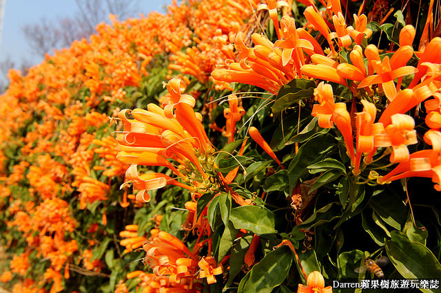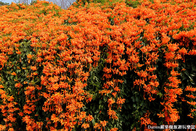 Darren以前就知道炮仗花成片很美,名字也很好記就像一串串鞭炮掛在牆面上,橘色花牆很吸晴