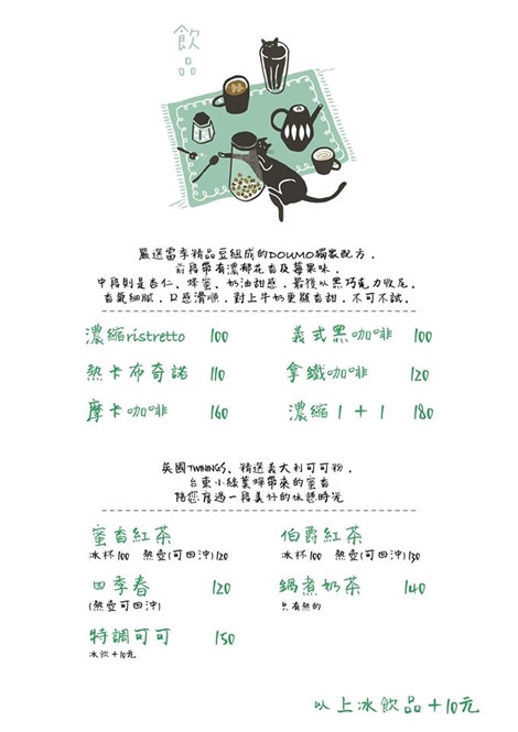 DOUMO 的菜單真的好可愛,還有手繪的插畫在上面,目前提供的餐點種類還不多,像早午餐目前只有三款,晚上則是只有咖哩飯,「之後會慢慢增加新菜色,一步一步陸續調整,而且我們每二個月就會換一次菜單,保留客人喜歡的,再加上新元素」,老闆這樣告訴我們,充滿熱情的語調,是能感受店家滿滿的用心:)