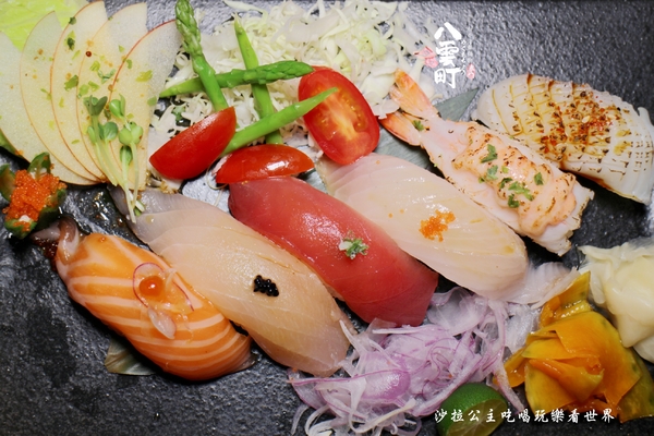 裡面有天使紅蝦、旗魚、紅魽、鮪魚、鮭魚卵、鮭魚、花枝...等