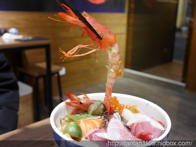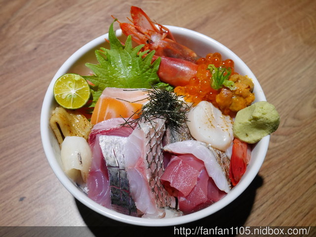 海味滿滿的丼飯,有大頭蝦、白帶魚、姬雕、黑格、鯖魚、鮭魚、星鰻、拿崙魚、堅魚、紅甘、干貝、比目魚、海膽、鮭魚卵等組成