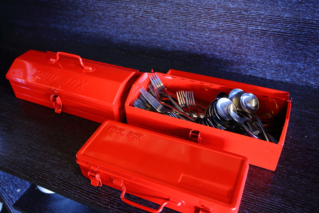 開水、餐具醬料請自取,餐具竟然在手提箱裡耶,可愛吧!