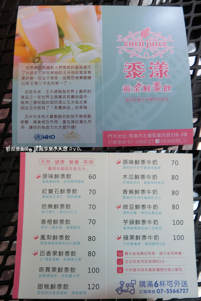 話說高雄有一家以玉米為主的飲料店-黍漾 黃金鮮黍飲,看完了店家簡介後覺得新鮮又頗具特色,所以哈捏帶著既期待又怕受傷害的心情去體驗黃金鮮黍飲!!