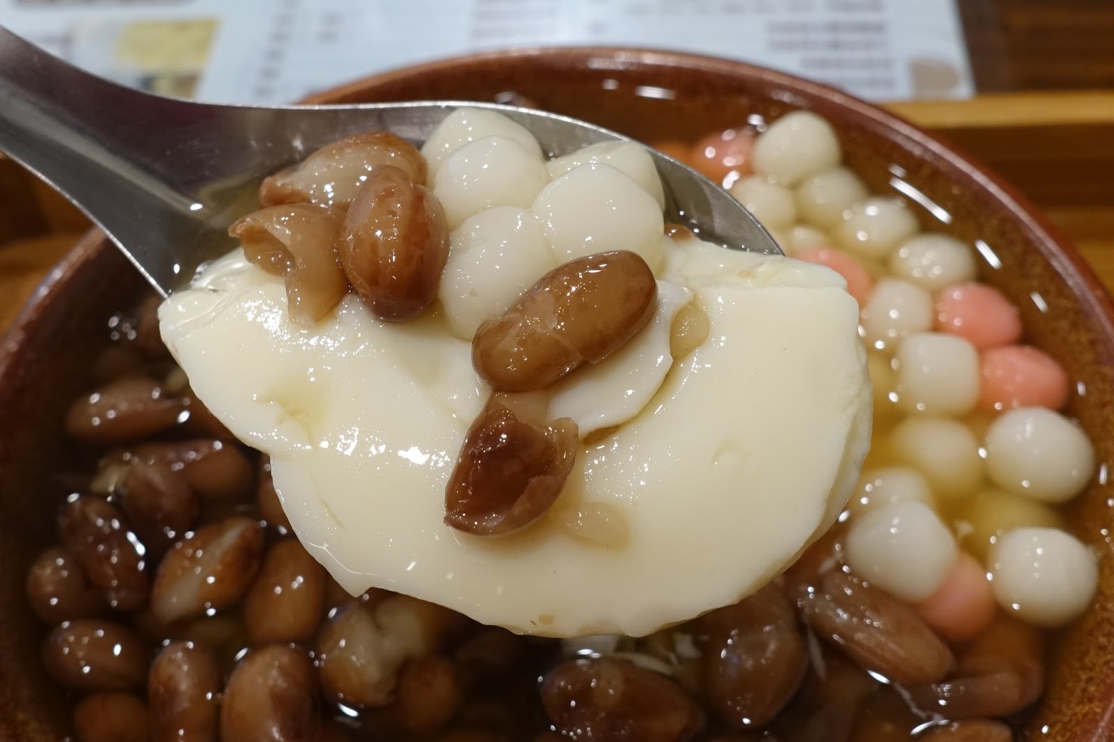 另外一碗我們選了加熱薑湯的花豆湯圓豆花,整碗看起來料好多,薑湯的甜度很低,怕胖的人也不用太擔心,熱熱的薑湯喝下去身心都暖活了起來。