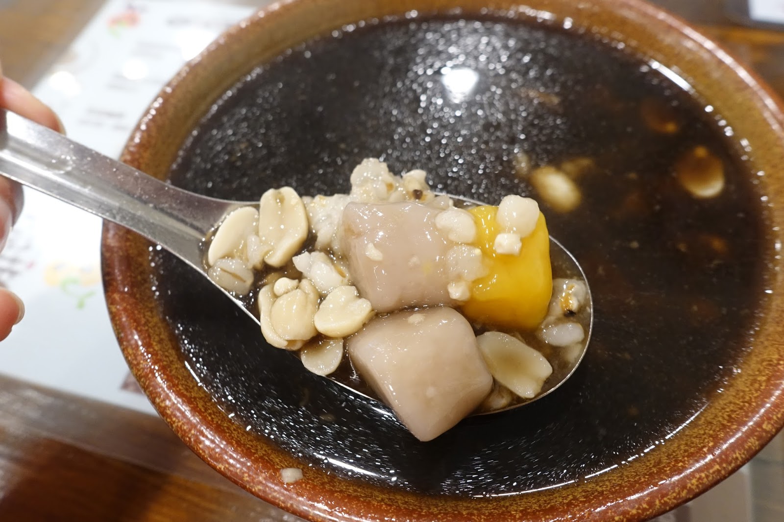 我選了九份芋圓、地瓜圓、薏仁和花生,整碗配料滿滿,由於花生帶著油脂,所以整碗燒仙草看起來油亮亮的,芋圓的口感很好,吃起來帶著芋頭的香氣而且很軟Q,越嚼越香,熱仙草湯的仙草香氣很濃厚也不會太甜。
