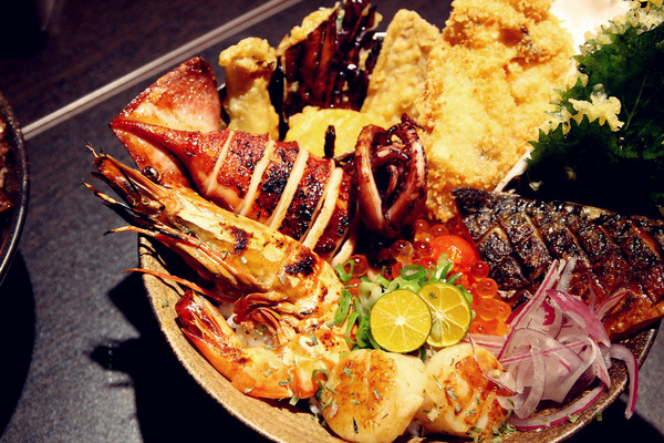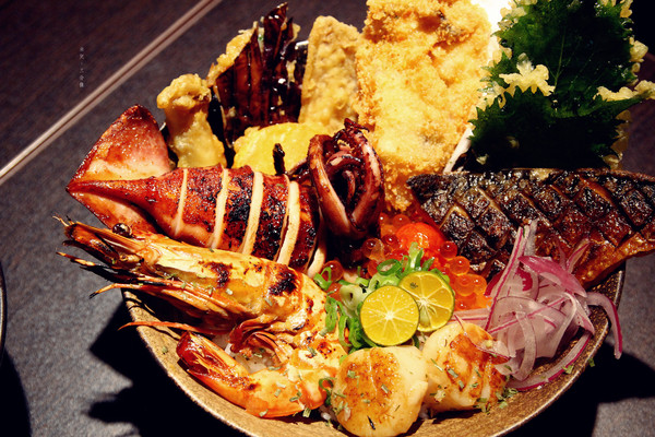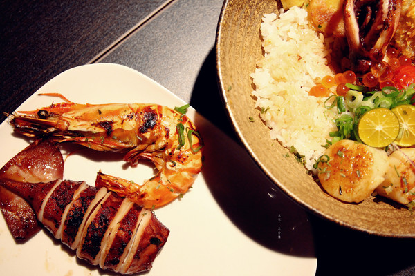 分別是一整尾的魷魚 超大顆的東石鮮蚵 兩顆干貝 一片鯖魚 一隻手掌蝦