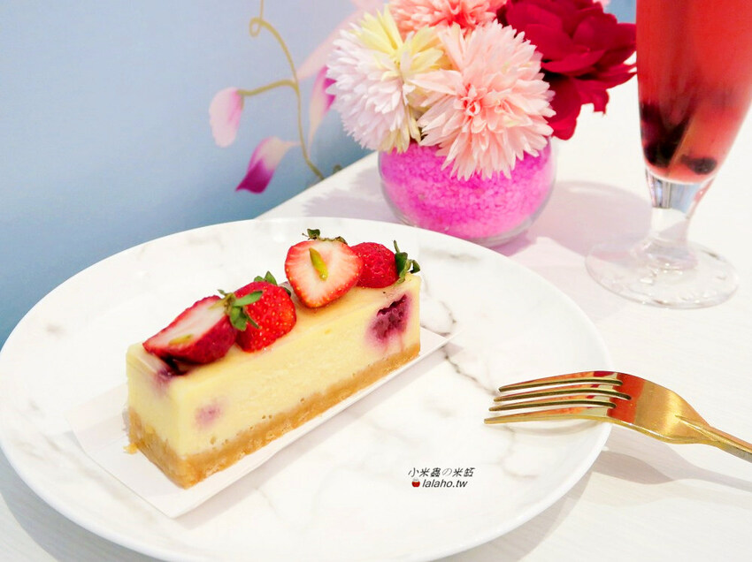 底下是口感紮實的重乳酪蛋糕,上頭擺放了一顆顆鮮紅欲滴的草莓