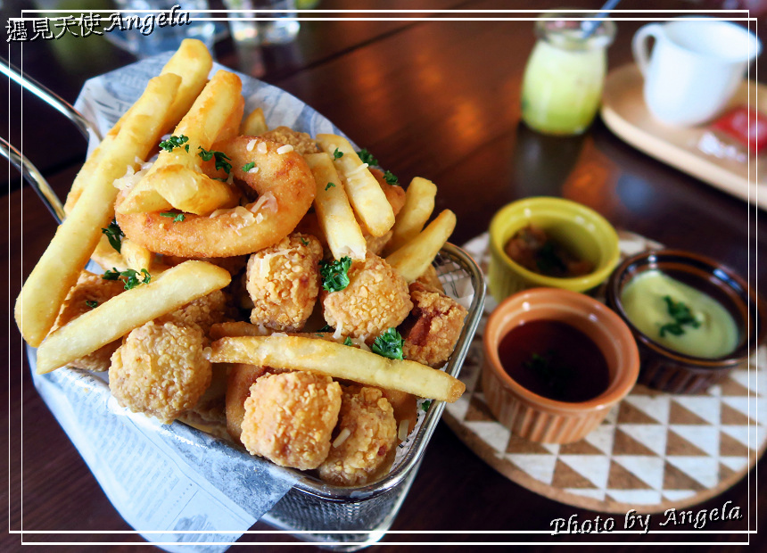 綜合炸物三拼 - 有酥炸雞腿丁、洋蔥圈與脆薯。這個份量很大,建議2-4人一起分享比較剛好。