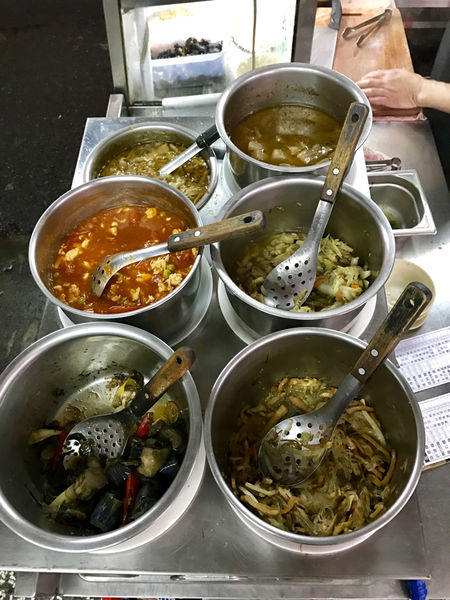 走近ㄧ看⋯發現菜幾乎都快賣光了、詢問之下.才知道老闆從早上11:30就開始營業到晚上8:30 、我們來的時間都快19:30了.也難怪菜都賣光光了