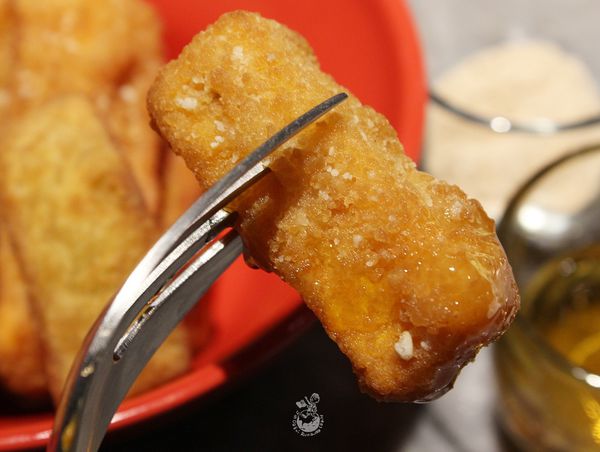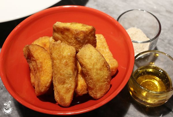 炸蕃薯仔有附蜂蜜和自製梅粉兩種沾醬,友人覺得蕃薯佐蜂蜜很有創意,梅粉是鹹酸的,不管蕃薯仔和哪種醬料結為連理一同入口都美拍呷 !
