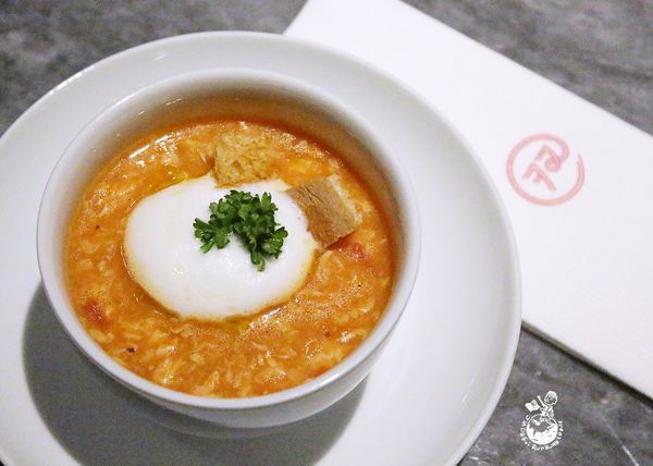 看濃湯讓我登愣了一下,截至目前為止我還沒見過這款式的濃湯,感覺像是番茄炒蛋的濃湯版,再加上吐司丁和奶泡