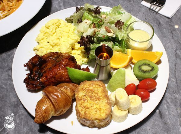 這是全日早午餐系列的餐點,內含濃湯、沙拉、水果、麵包、炒蛋和照燒雞腿排