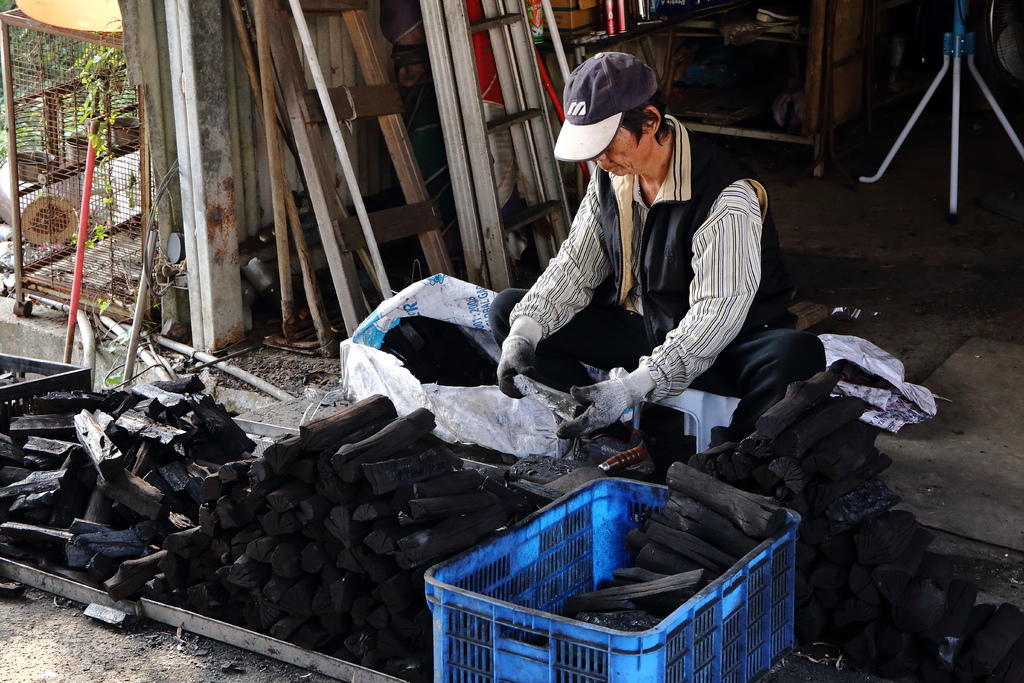 老闆劈炭的手沒停過哩,每一爐都會重新換上新的木炭