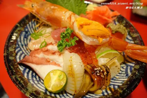 丼飯上面擺滿了鮭魚、鮪魚、旗魚、鰻魚、干貝、章魚、蟹肉、蟹膏、鮭魚卵,