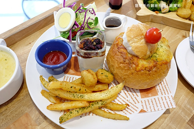 蕃茄燉牛肋是這盤的主角,光是熬煮的時間就足足花了三個半小時,慢工出細活,好滋味自然也不在話下,而配菜還有軟法麵包、油醋沙拉、薯條、雞塊,及草莓醬優格。