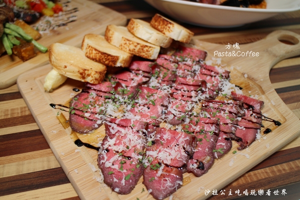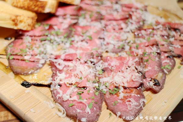 烤的半熟的燻牛肉,淋上巴沙米哥醋及現刨的帕瑪森起司,味道相當有層次