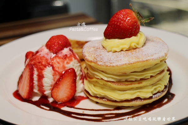 在這鬆軟又厚實的煎餅上再撒上糖粉與卡士達醬搭配在一起提升了煎餅的味道