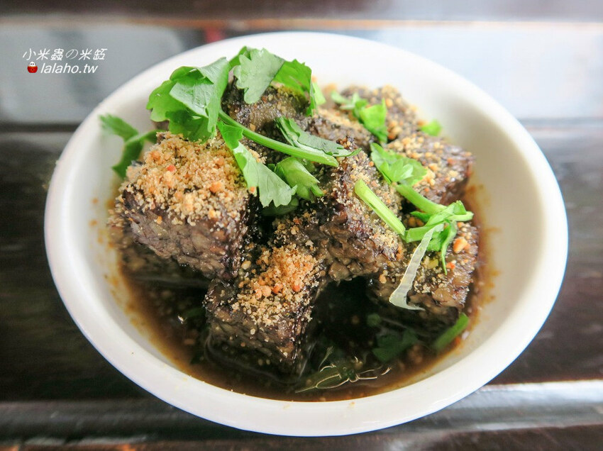 Q軟黏牙的豬血糕,上桌前還會淋上壺底油、撒上花生粉跟香菜