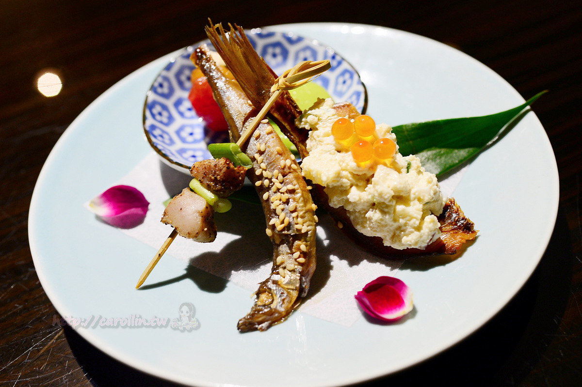 烤魚骨搭配豆腐沙拉,沙拉內有豆腐泥、蛋白、水果等,配上幾粒鮭魚卵,香氣和口感的層次都很豐富。