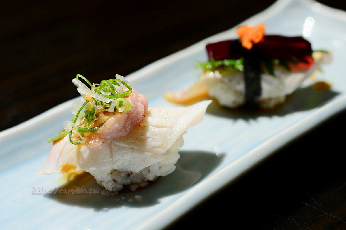 載著蔥花鮪魚肉泥的是比目魚握壽司,綿密柔滑的鮪魚泥配上帶彈性的比目魚,形成有趣的口感對比。