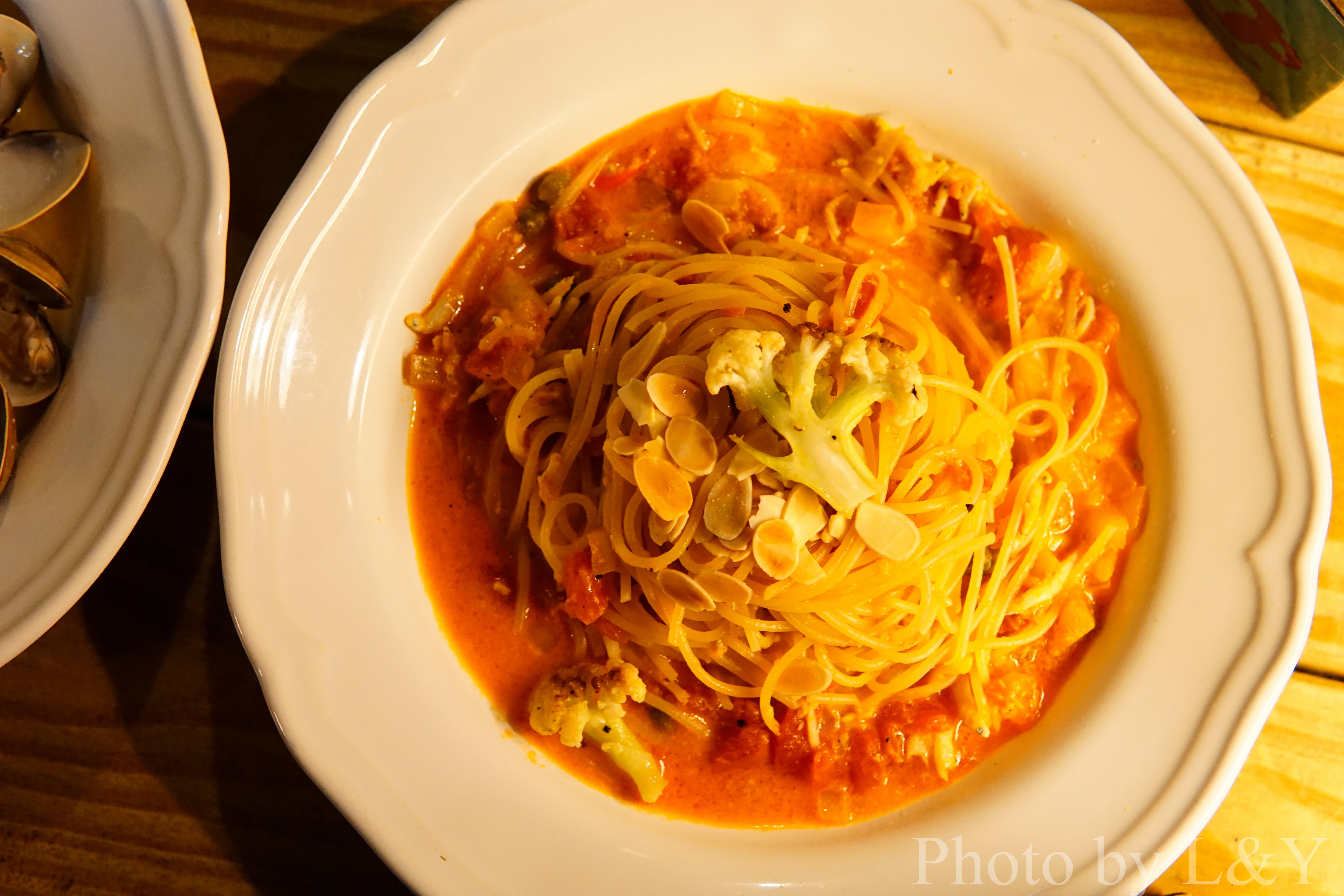今日重頭戲之一: 漁夫蛤蠣義大利麵,店家善用了基隆海產直送的地利優勢,蛤蠣份量足,而且應該是在蛤蠣殼一打開就關火,所以吃起來還有一點像生蠔的那種鮮味(到開車回家的路上,我都還在想念這個味道),只有夠新鮮的食材才能這樣料理阿!個人相當喜歡這道麵本身的份量也足夠