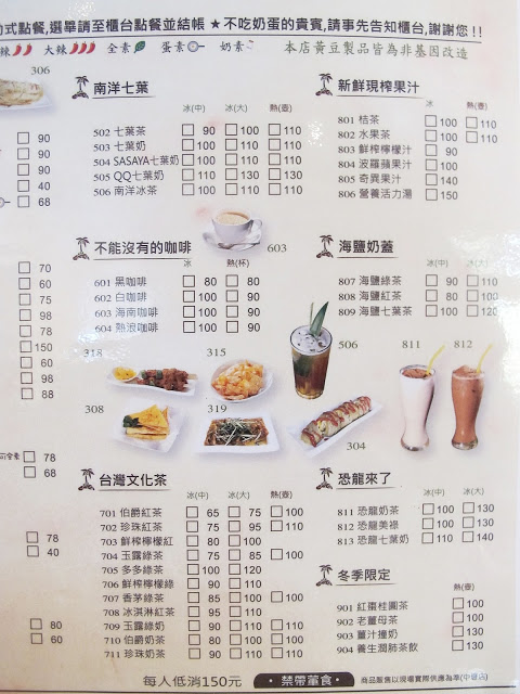 飲料(南洋七葉、不能沒有的咖啡、台灣文化茶、新鮮現搾果汁、海鹽奶蓋、恐龍來了、冬季限定)、甜品、點心,選擇真的超級多,當天我們選好久,好想每種都來一份 XD