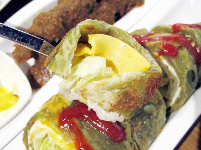 QQ捲餅,外面是香椿捲餅裡捲上了起士、青菜搭上蕃茄醬超對味